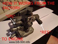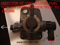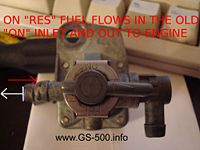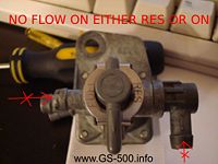 1. First let's define how the petcock works before the mod. Putting the selector on "ON" allows fuel to flow from the "ON" inlet to the ENGINE when there is vacuum on the vacuum port. Putting the selector on "RES" allows fuel to flow from the "RES" inlet to the ENGINE when vacuum is in the vacuum port. Putting the petcock on "PRI" allows fuel to flow from the "RES" inlet to the ENGINE when there is NO VACUUM
