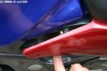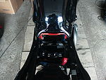 Nun nehmt Ihr euch die Heckverkleidung und montiert diese wieder. Die vordere Aufnahme für das Heckteil hat ja durch den neuen Tank keinen Halter mehr. Ihr nehmt euch den Blechstreifen und bohrt ein Langloch wie das vom alten Tank in den Blechstreifen. Nun knickt ihr den Blechstreifen passend, das genug Platz für den Gummi ist und ihr die beiden Enden auf den Hauptrahmen auflegen könnt.