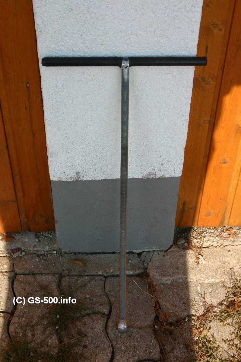 Ich habe von der Gewindestange einfach 32 cm abgesägt und dieses kurze Stück wie einen T-Griff oben auf die Gewindestange aufgeschweißt.