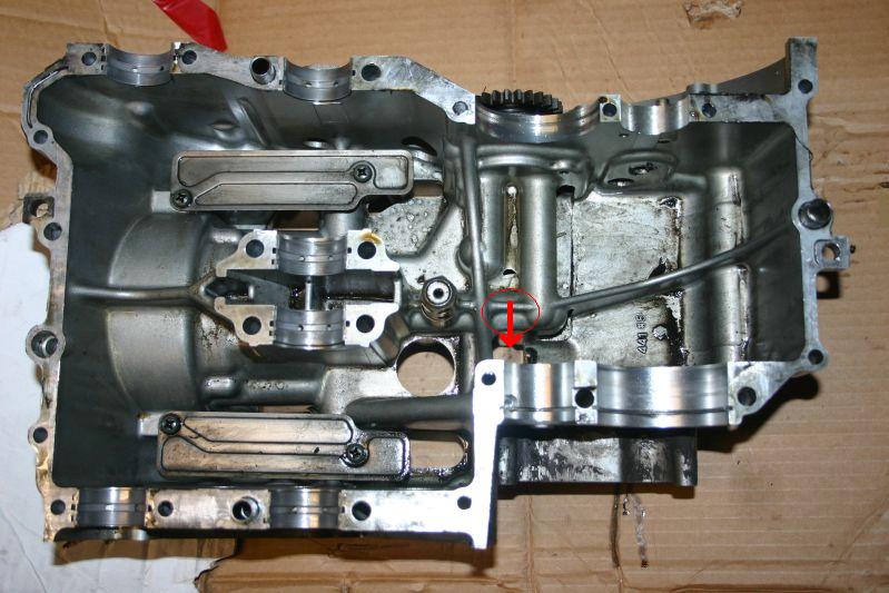 Sie haben in den F Motor einen zusätzlichen Kanal gegossen(roter Kreis mit Pfeil im ersten Bild), und diesen hinten (das Ovale im Bild 2) über die Ölwanne abgegriffen.