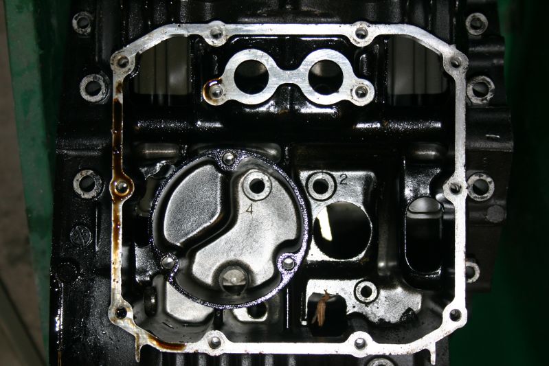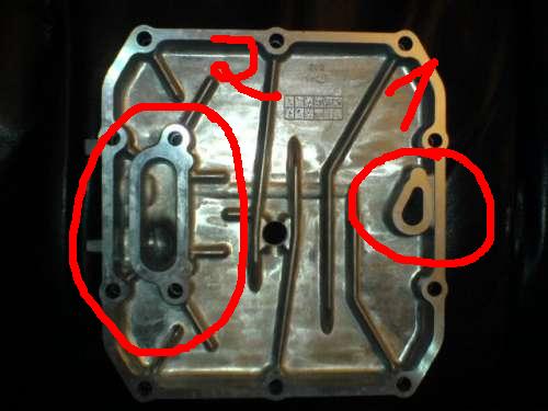 Hier ein Bild von der Ölwanne. Im Kreis 1 wird das Öl durch die Ölwanne und dann unter der Wanne nach vorne geleitet, dort fließt es in den Ölkühler.