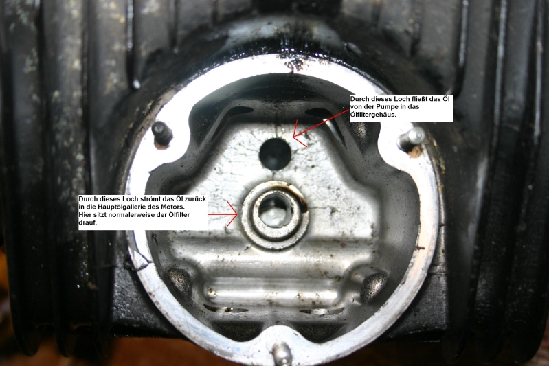 Durch das obere Loch wird das Ölfiltergehäuse durch den Druck der Ölpumpe befüllt. Auf dem Loch in der Mitte sitzt normalerweise der Ölfilter drauf. Dieses ist der Rücklauf in die Hauptölgalerie des Motors. Das Prinzip wie das Öl hier fließt ist also folgendes: