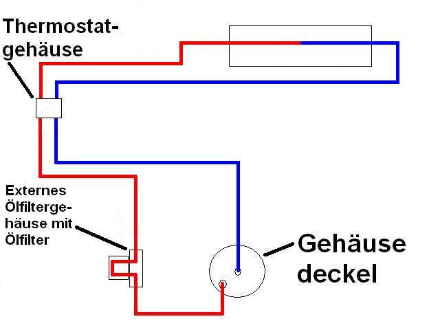 Das Öl fließt aus dem Ölfiltergeäuse des Motors durch den Schlauch in das externe Ölfiltergehäuse und wird dort gefiltert. Dann fliest es weiter zum Thermostat wo es gleich umgeleitet und bis zum erreichen der Betriebstemeratur dierekt zurück in den Motor geleitet wird.