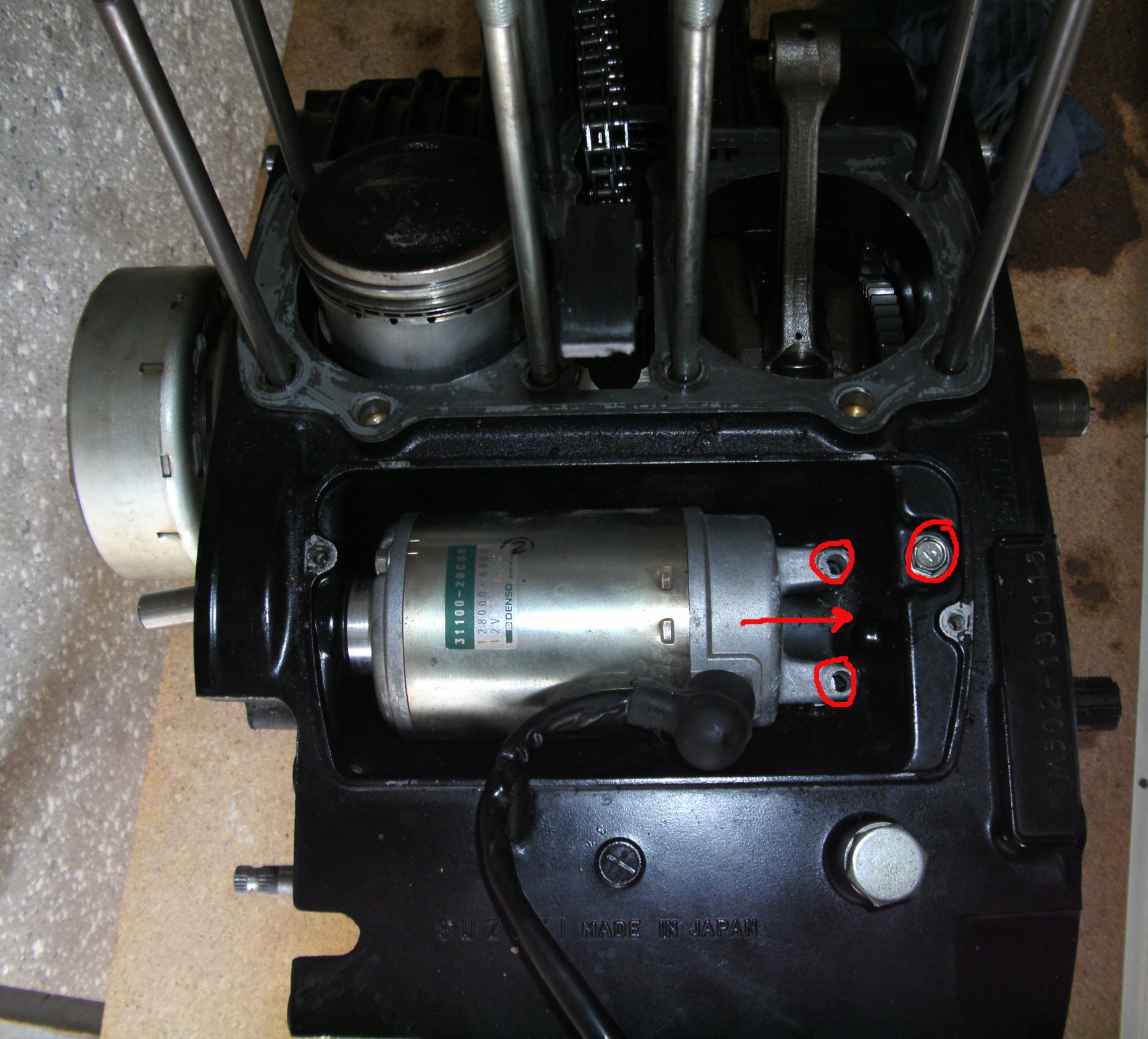 *die Befestigungsschrauben des Anlassers entfernen. <span style="color:red">Achtung</span>: diese Schrauben sind Feingewindeschrauben und lassen sich schlecht lösen da sie mit Sicherungslack eingeklebt sind. Unbedingt gefühlvoll an diese Schrauben heran gehen.