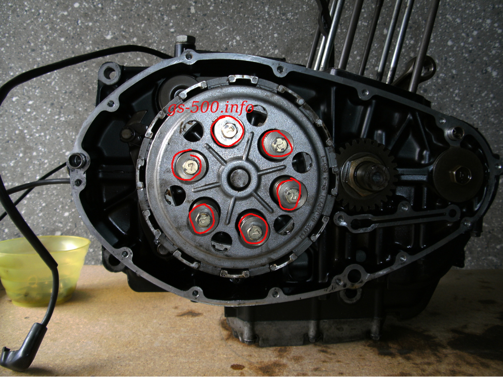 *Die Kupplung sollte bereits bei eingebauten Motor ausgebaut werden. Getriebeseitig kann der Korb allein dadurch arretiert werden, in dem das Motorrad auf dem Seitenständer steht und ggf. die Bremse betätigt wird. Die hier beschriebene Vorgehensweise mit Schraubzwingen stellt nur eine Notlösung dar.