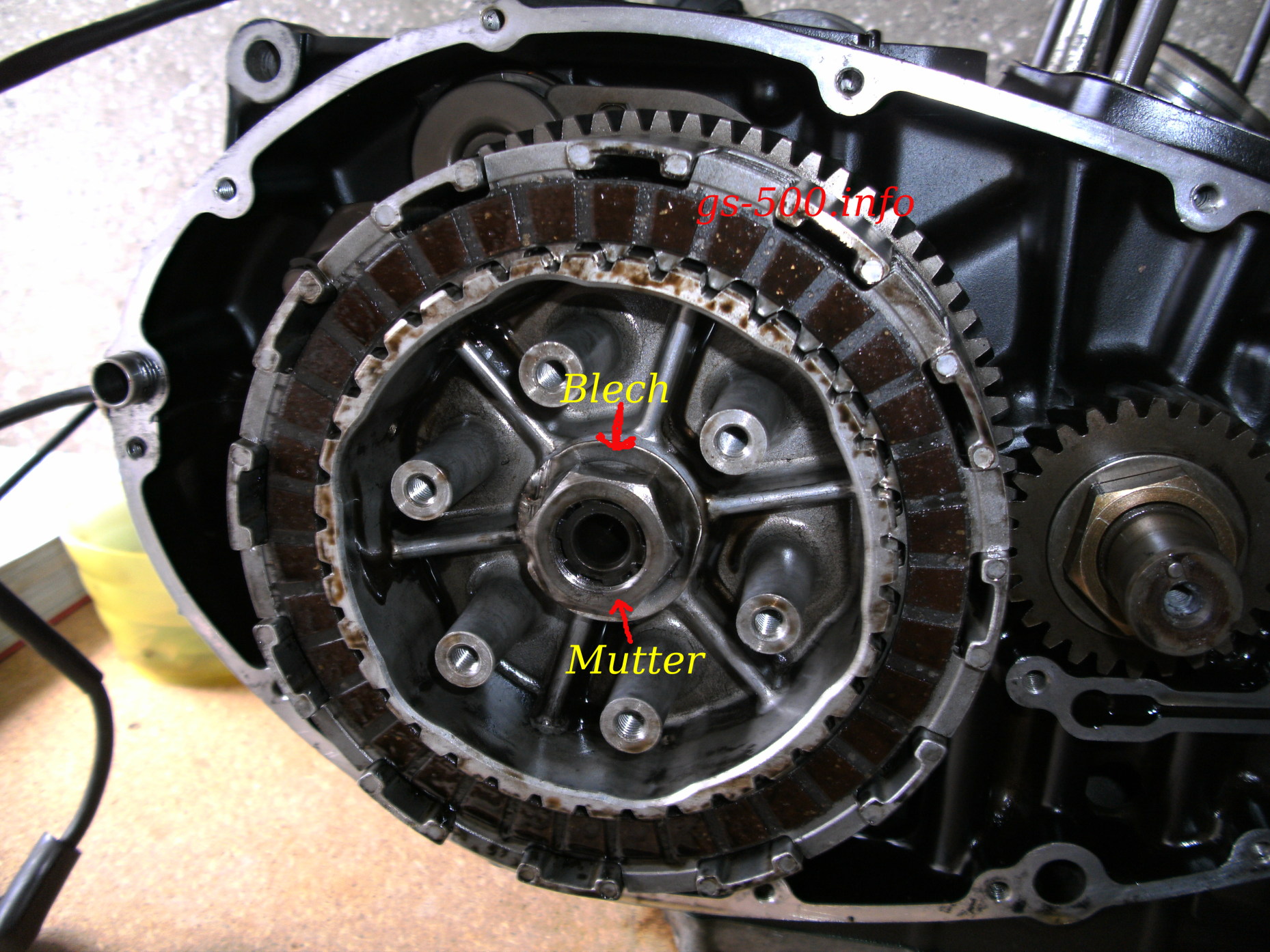 *Kupplungskorb getriebeseitig mit Schraubzwingen arretieren. Die Zwingen müssen auf die Kupplungsscheiben drücken. <span style="color:red">Achtung</span>: Hier dürfen durch die Zwingen nur so viel Druck ausgeübt werden, wie zum Lösen der Nabenmutter nötig ist. Eine zu stark angezogene Zwinge wird zum Bruch der Reibscheiben und zum Verzug der Stahlscheiben führen. Kurbelwellenseitig arretiert man ihn am besten mit einen dicken Lappen, welchen man zwischen die Zahnräder der Kurbelwelle und des Kupplungskorbs stopft. Arretiert man den Korb nicht, dreht er sich beim Entfernen der Nabenmutter mit. Ohne Lappen zwischen Kurlebwelle und Kupplungskorb würde sich die Kurbelwelle mitdrehen.