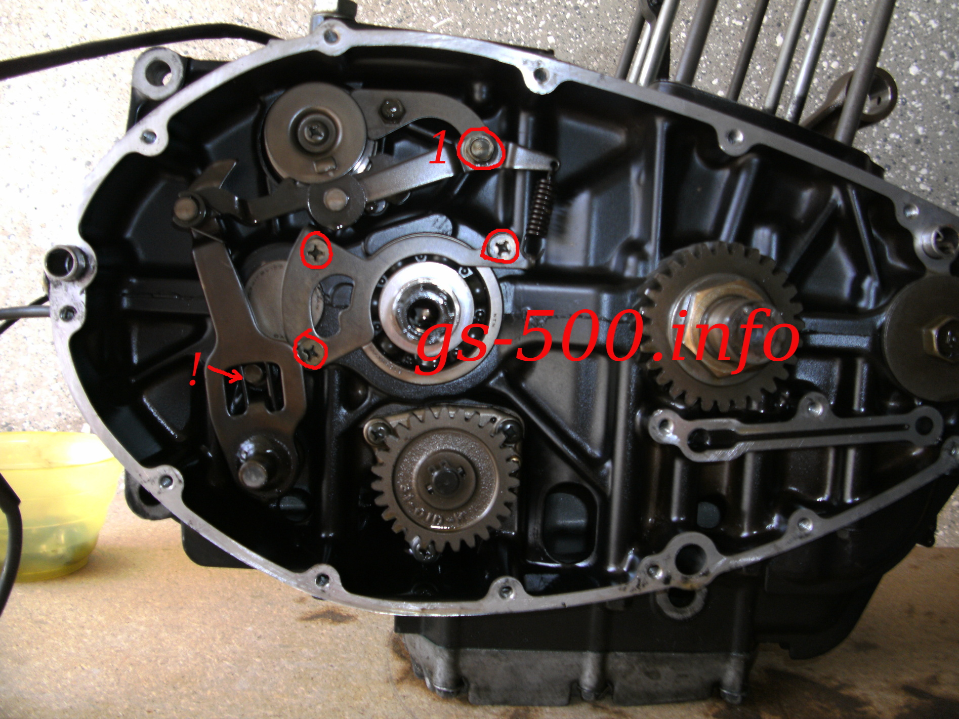 *die mit 1 markierte Schraube vom Schaltnockenanschlag entfernen. Die kleine Feder rechts daneben kann vorher ausgehangen werden.