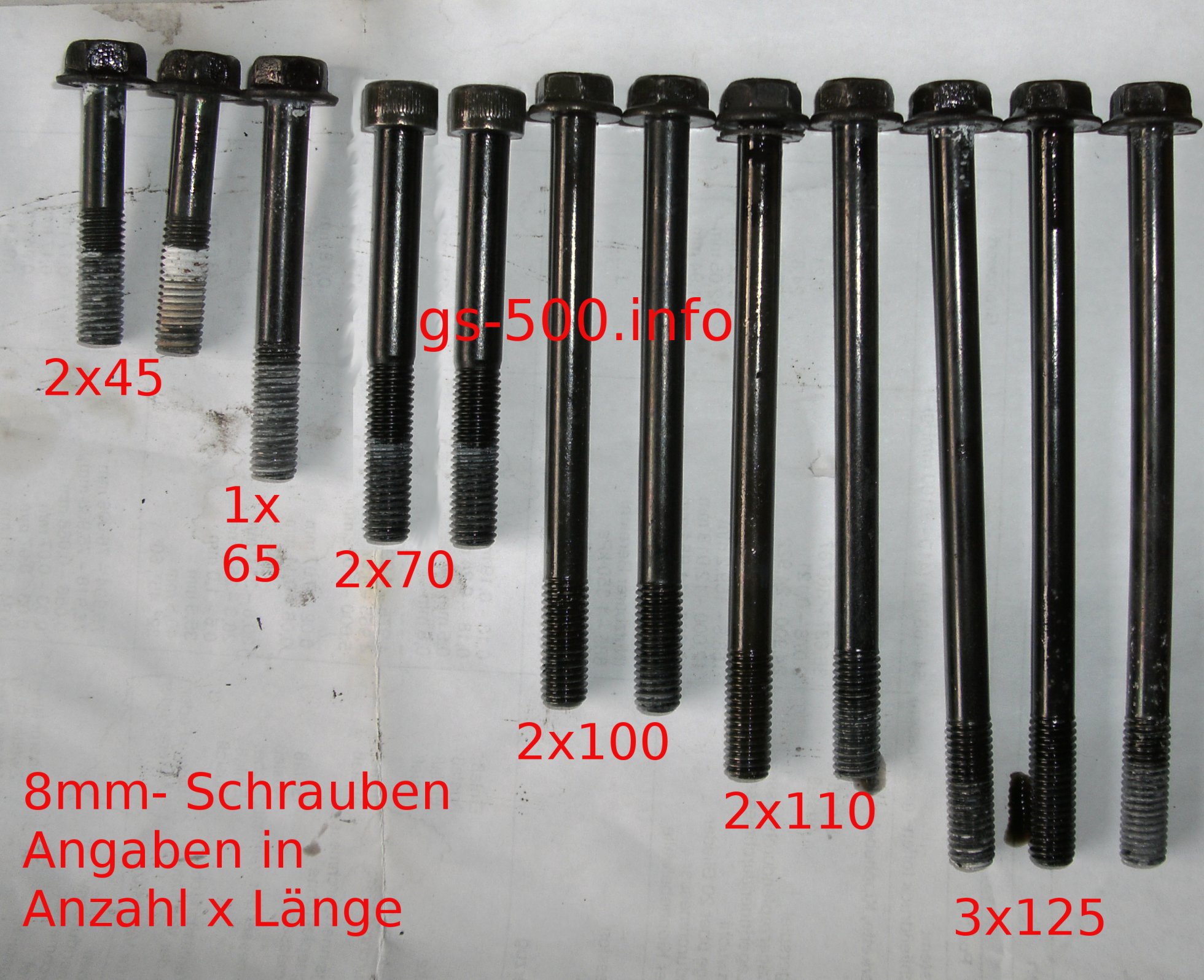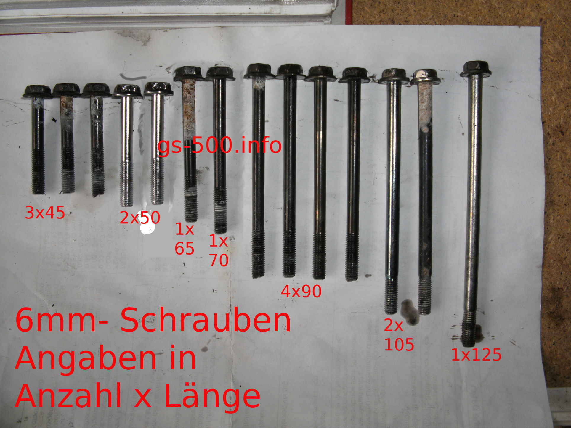 * Schrauben nach Gewindedurchmesser sortieren, die 8mm- Schrauben von den 6mm- Schrauben getrennt lagern. Das erleichtert später das Suchen beim Zusammenbau. Nun nochmal kontrollieren, ob auch wirklich alle Schrauben wie auf den Bildern gezeigt, vorhanden sind.