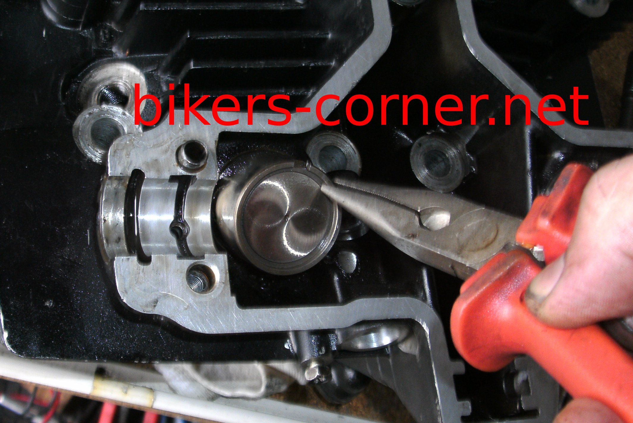 Die Kolben haben auf ihrer Oberseite einen Pfeil, dieser muss noch vorne zeigen. Den Clip montiert man am besten auf der Seite, die zur Steuerkette zeigt. Dazu eine Seite des Clips in die Aussparrung im Kolben setzen und andere Seite eindrücken. Den Clip nicht zu weit zusammenbiegen! Er rastet hörbar ein. Arbeitsgang am zweiten Kolben wiederholen.