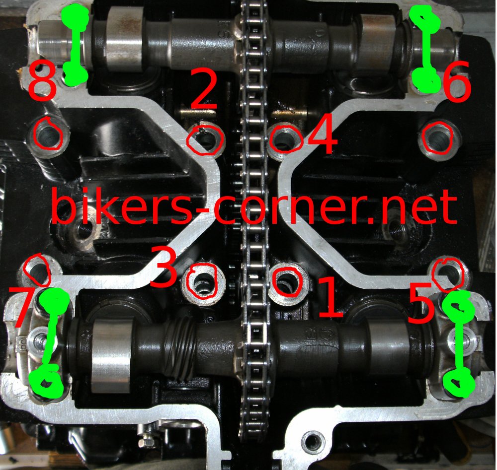 *Nockenwellenlagerdeckel motieren. Schrauben durch Neue ersetzen und mit 8-12Nm anziehen. Jeder Deckel hat seine eigene Position. Die Buchstaben auf dem Deckel und die im Kopf angebrachten Markierungen geben Aufschluss über die richtige Position