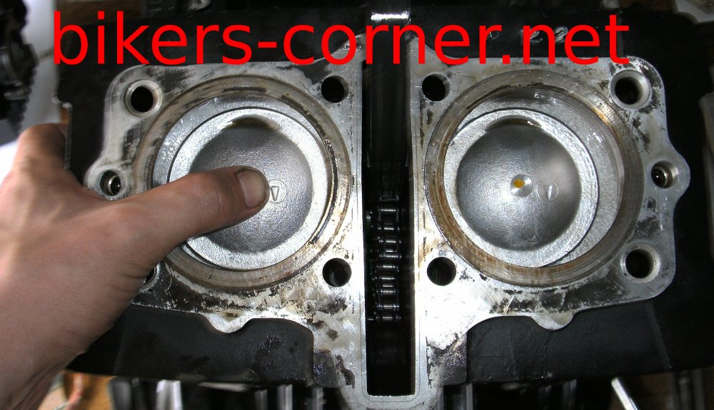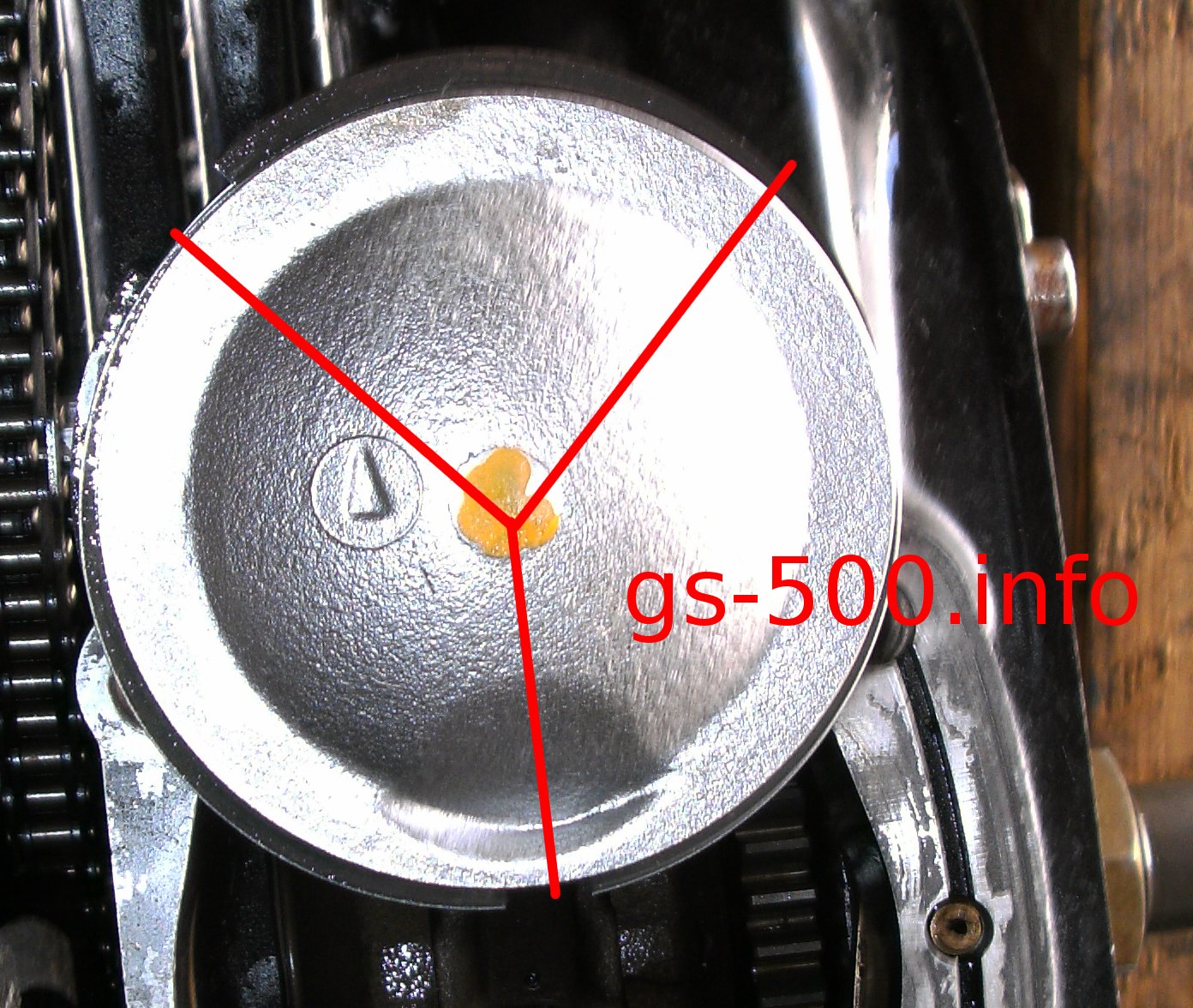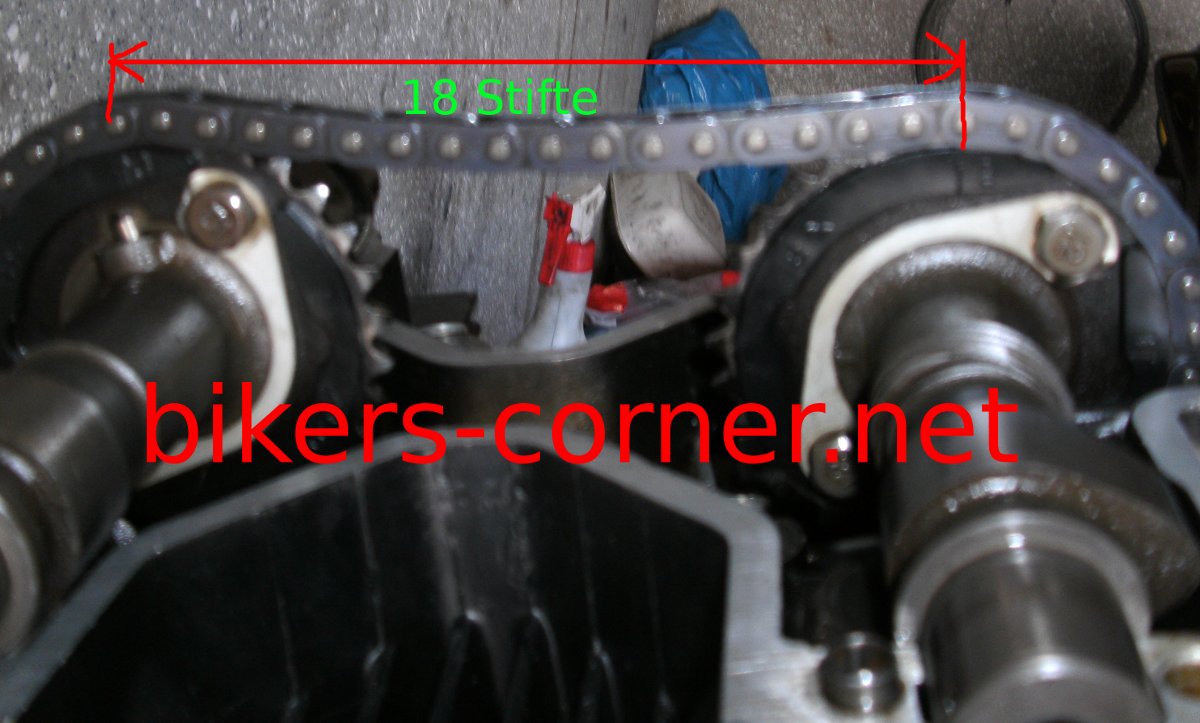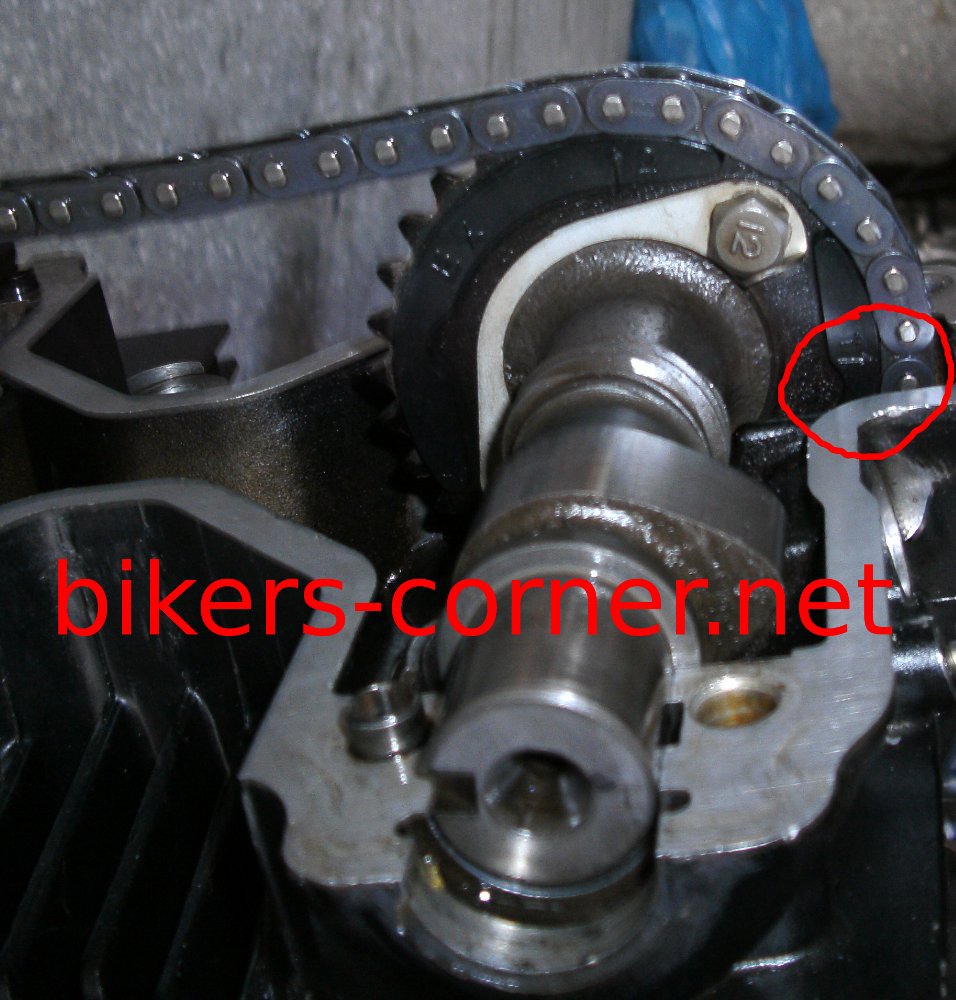 Es ist nicht sonderlich wichtig, die RT- Markierung auf den Millimiter genau zu treffen. Die Bilder zeigen die Kurbelwellenposition für den Fall, dass die Kette je einen Zahn zu früh oder zu spät eingehangen wird.