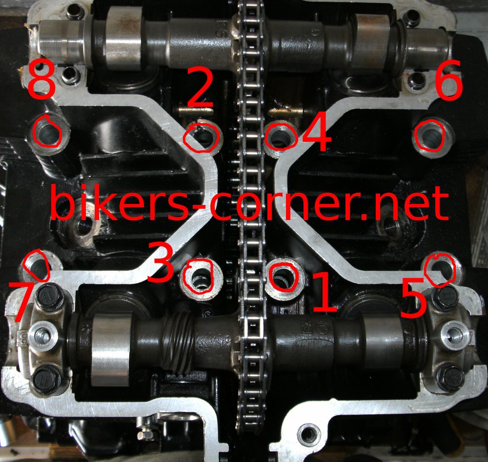 *Zylinderkopf aufsetzen, Zylinderkopfmuttern und Unterlegscheiben anbringen. Muttern in der vorgegebenen Reihenfolge mit 35-40Nm anziehen. Die kleine Schraube zwischen Bank und Kopf im Anschluss mit 8-12Nm anziehen.
