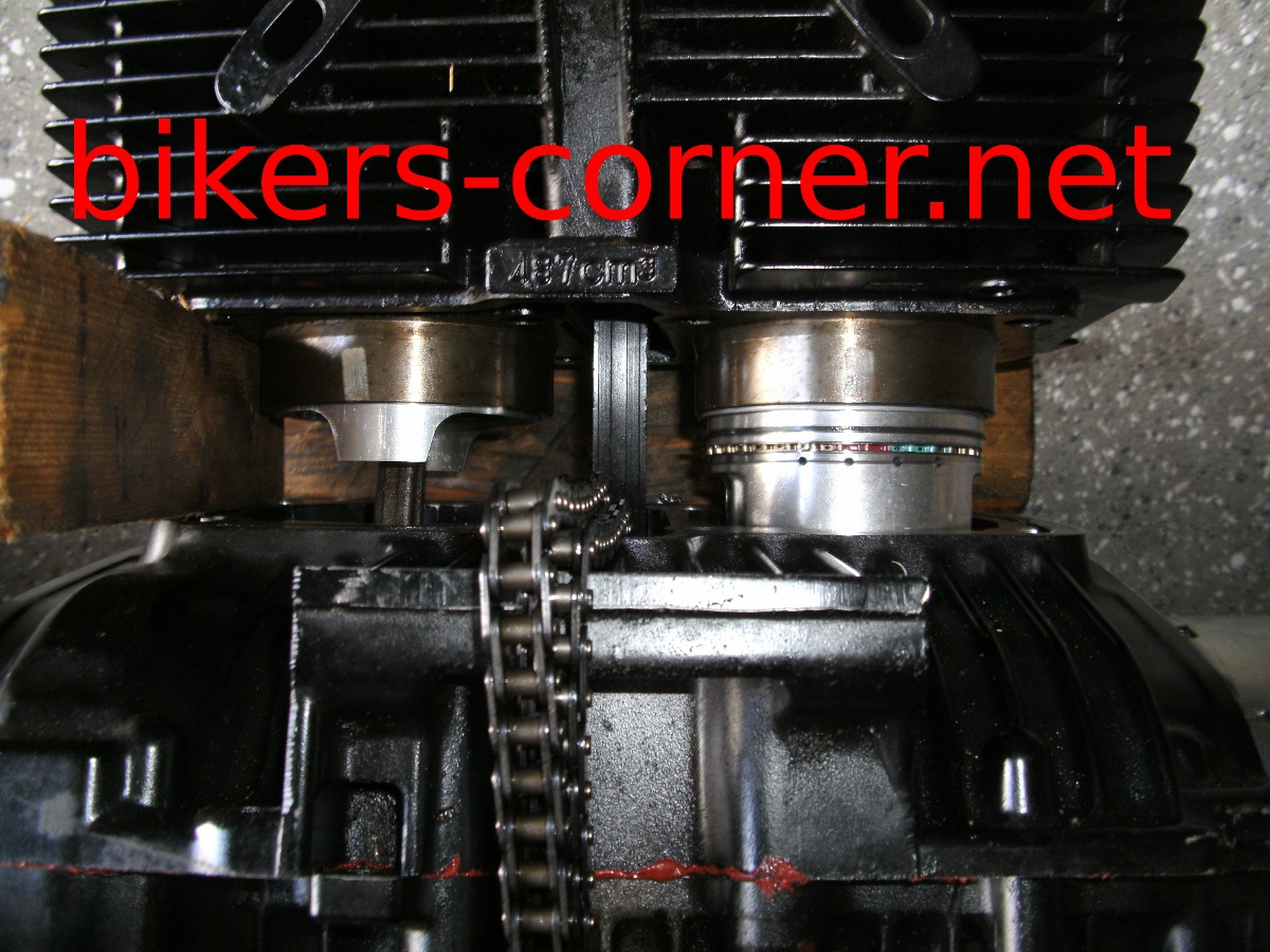 Nun kommt der fummeligste Teil: die Montage der Zylinder. Hier kurz nicht aufgepasst, schon bricht ein Kolbenring. Die Zylinderbohrung ist am unteren Ende etwas geweitet um den Einbau der Kolben zu erleichtern. Der Platz reicht aber nicht aus, um die Kolben ohne Fummelei in die Buchsen zu führen. Auf keinen Fall unbedacht Druck von oben auf die Bank geben! Zu allen Überfluss müssen die Stoßfugen der Ringe um 120° zueinander versetzt sein, was das Einfädeln wesentlich erschwert.