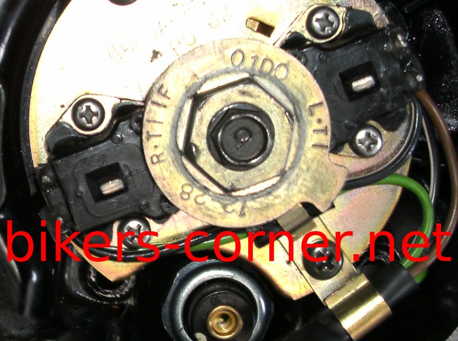Bei der Motage der Lagerdeckel dreht sich die Kurbelwelle automatisch ein paar Grad entgegen die Laufrichtung. Um zu sehen ob auch alles richtig sitzt, kann man nun die Kurbelwelle ein Stück weit drehen. Die RT- Markierung am Zündimpulsgeber und der mit "1" markierten Pfeil auf der Auslassnockenwelle müssen fluchten. Die Kette muss dabei stets unter Spannung gehalten werden, sie kann durch die Ventilfederkräfte schnell überspringen.