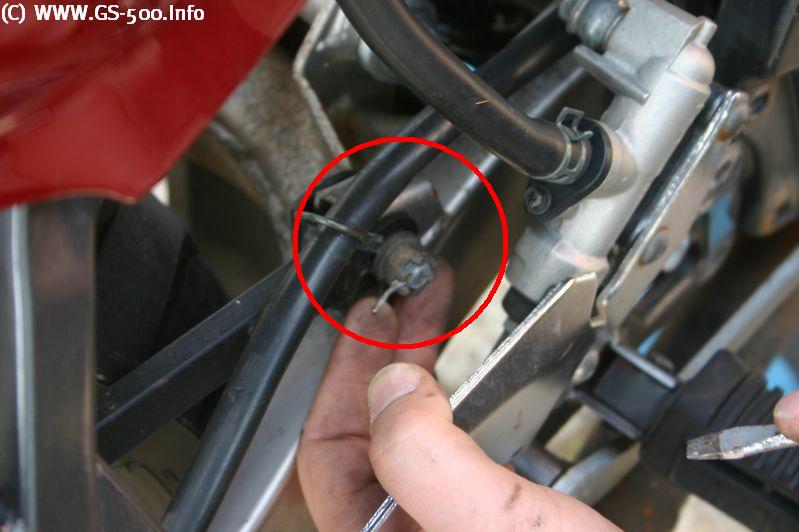 Ahora llegamos sin problemas al tornillo para voltear el soporte hacía adelante. Para aflojar el tornillo hay que desdoblar al seguro del tornillo de ancla de freno (la imagen 8). Luego cortar la clavija (la imagen 9) y sacar hacia abajo . Ahora puedes destornillar a la tuerca y tienes el soporte en la mano (la imagen 10).