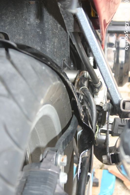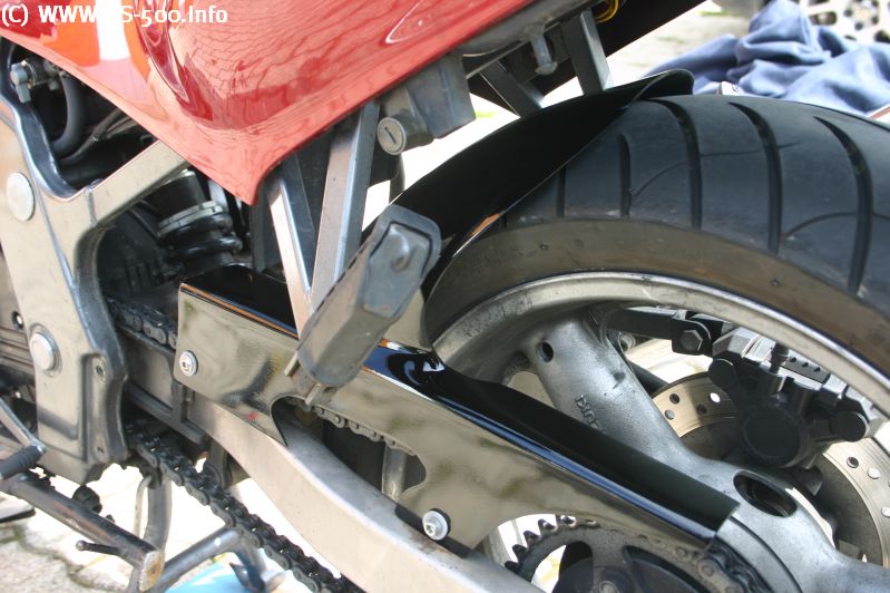Al fin tienes que ajustar la cubierta y luego amarrar los tornillos y los cinchos. Asegurate que la cubierta queda lo más adelante posible encima del basculante antes de fijarla. Si no corres el peligro que empieza de arrastrar la cobertura en el neumático.