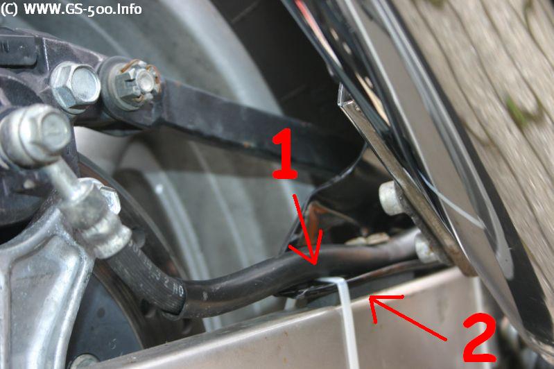 Ahora introduces la cubierta por detrás sobre el neumático y la pones en el basculante. Del lado del freno doblas la lengüeta de la línea de freno y sacas ésta (la imagen 11, círculo rojo). Ahora metes la cubierta por debajo de la lengüeta. La pieza adicional entregada de goma / espuma (la imagen 12) es empujada bajo el agujero trasero (la imagen 13, No.2) y primero fijado levemente con un cincho (la imagen 13, No.1). Ahora empujan la línea de freno de nuevo bajo la lengüeta. Luego reatornillas la lengüeta de nuevo en el soporte de freno y la ajustas.