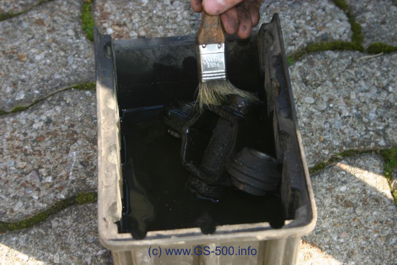Ihr nehmt die Schale mit Benzin und drückt die Buchsen aus der Umlenkung in die Schale und legt sie erst mal ein. Dann nehmt Ihr euch den Pinsel und pinselt den ganzen Dreck und Schmutz erst einmal außen von der Umlenkung.(Bild 1)