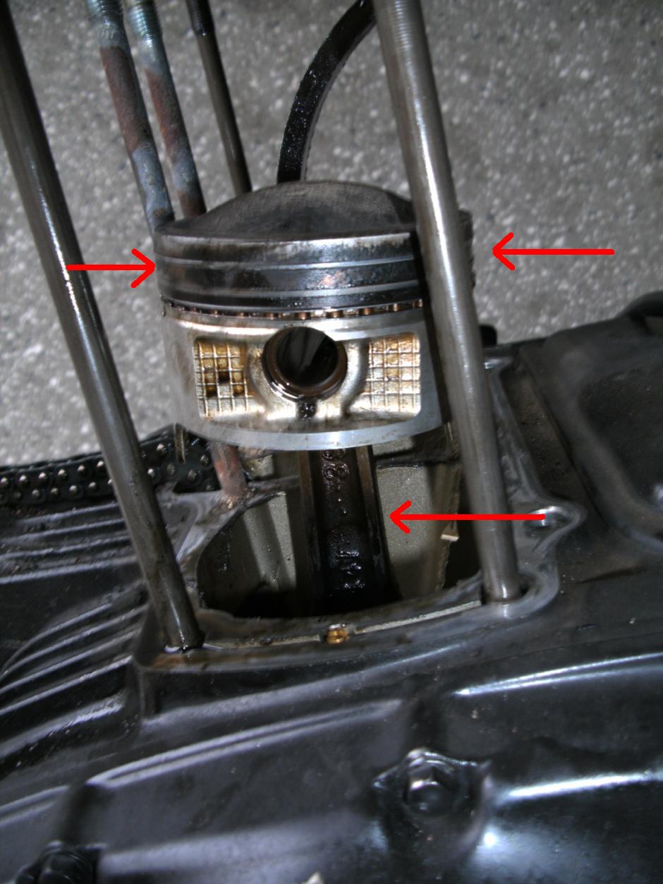 Die Kolbenstange steht hier senkrecht auf dem Kurbelwellenzapfen ohne an den Stehbolzen anzulehnen. Bei einem unbeschädigten Pleullager würde die Pleulstange und der Kolben nach vorne oder hinten kippen. Durch die zerfressenen Gleitlager sind Pleul und Kolben schwergängig, stehen kerzengerade. Auch ist hier zu sehen, dass sich die Kolbenringe in den Rillen des Kolbens festgebacken haben. Diese müssen jedoch 1-2mm aus den Rillen heraustreten. Leicht erkennen lassen sich die Überhitzungsspuren an der Pleulstange, sie wird von unten nach oben immer heller.