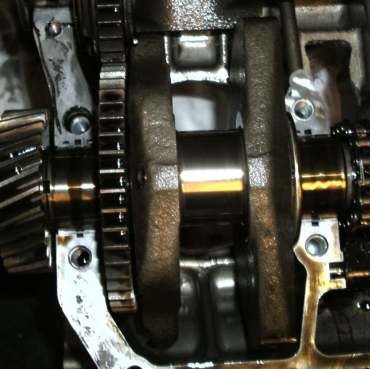 Der linke Zapfen der Ausgleichswelle und die dazugehörigen Lager weisen Fressspuren auf. Merkwürdiger Weise waren die Spuren am Wellenzapfen nur halbkreisförmig zu sehen.