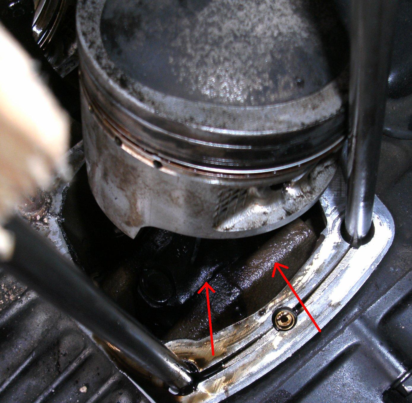 Viel hilft nicht immer viel. Die Dichtmasse muss zum Zusammenbau des Kurbelwellengehäuses dünn auf die Dichtflächen aufgetragen werden. Der im Bild markierte "Propfen" Dichtmasse soll nur veranschaulichen, dass dieser Forderung nicht entsprochen wurde. Immerhin wurden die Ölbohrungen nicht mit Dichtmasse zugekleistert. Ob man dies dem Zufall verdanken kann oder es gewollt war, sei dahin gestellt.