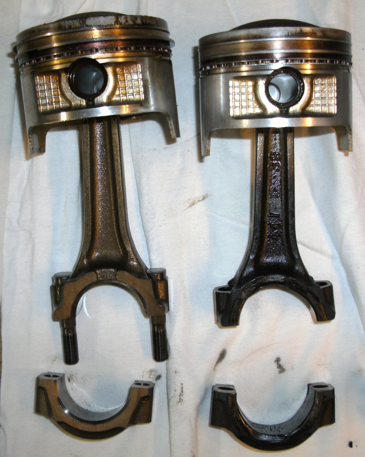 Hier eine direkte Gegenüberstellung von funktionstüchtigen und zerstörten Bauteilen. Im linken Bild sieht man an der rechts liegenden Pleulstange die Schwarzfärbung des Pleulstangenfußes. Links zu sehen ist eine funktionstüchtige Pleulstange.