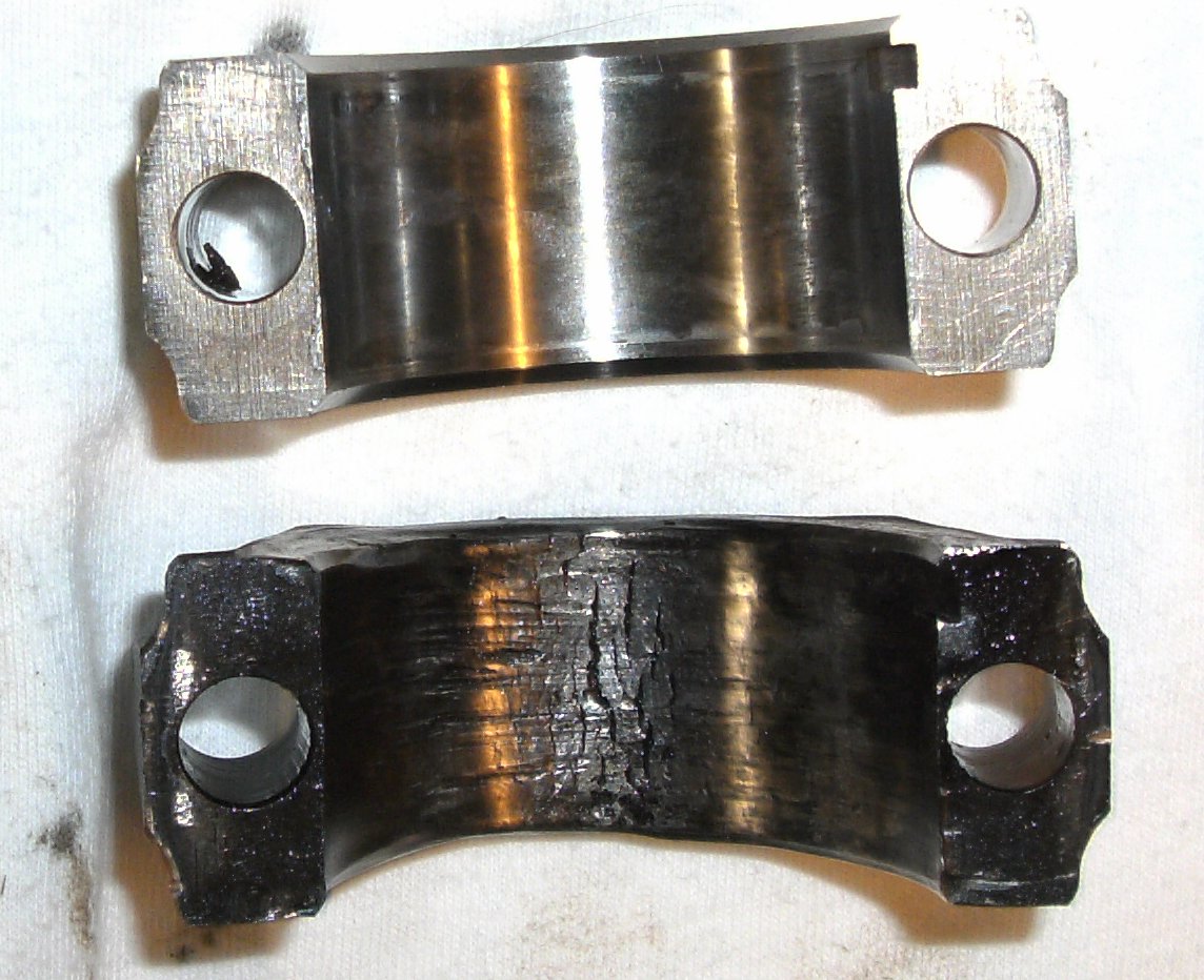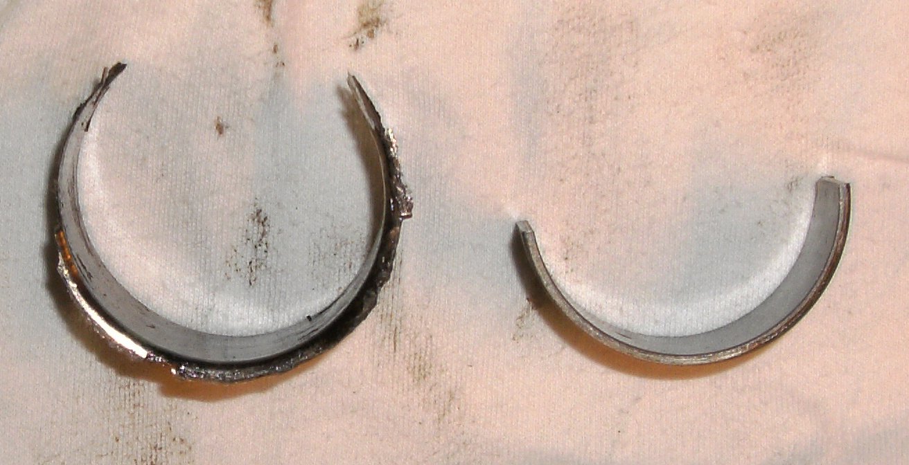 Rechts eine funktionstüchtige, links eine zerfressene Pleullagerschale. Das abgetragene Material hat beim Fressen des Lagers keinen Weg nach Außen gefunden, also quetschte es sich rund um den Kurbelzapfen.