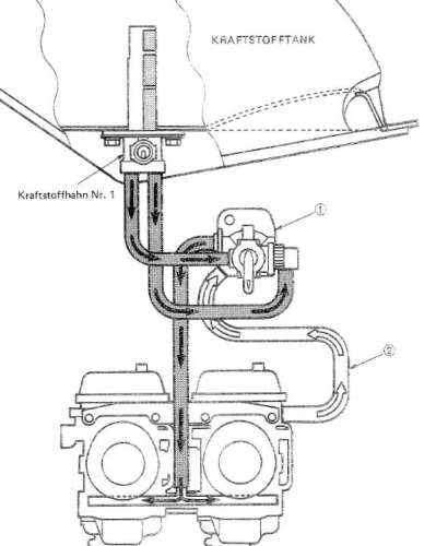 Geht von der Rückseite des Benzinhahnes an den linken Vergaser in Höhe der Drosselklappe. Dieser Schlauch ist der Unterdruckschlauch. Bei laufendem Motor wird über diesen Unterdruckschlauch die Membran im Benzinhahn geöffnet und das Benzin kann fließen.