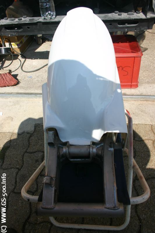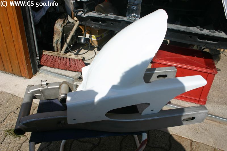 Carsten hat noch eine Hinterradabdeckung für die GS Schwinge gebaut. Diese wird sowohl bei dem Serienreifen als auch bei den [Felgenumbauten](/umbauanleitungen/#hintere-felgen) in die GS Schwinge passen. Geliefert wird ein echt klasse GFK Rohling, mit kleinen Anpassungsarbeiten passt er ganz schnell auf die GS Schwinge. Die Passform ist sehr gut gelungen.
