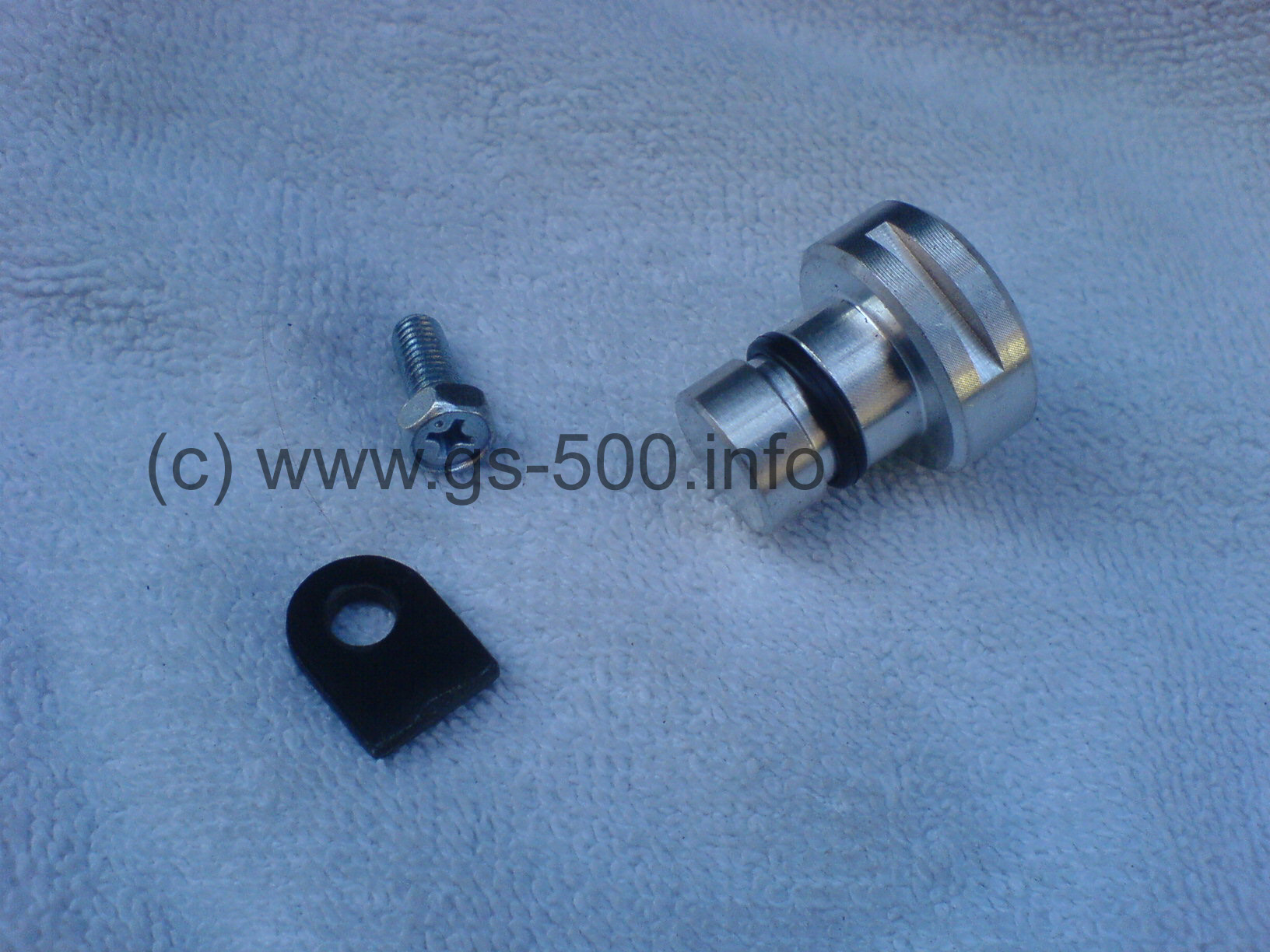 Nach Anbau eines digitalen Drehzahlmessers und Entfernen der alten Drehzahlmesserwelle sollte das entstandene Loch geschlossen werden, da sonst Öl ausläuft. Mit ein paar Teilen der GS500F ab 2004 lässt sich das sehr simpel lösen.