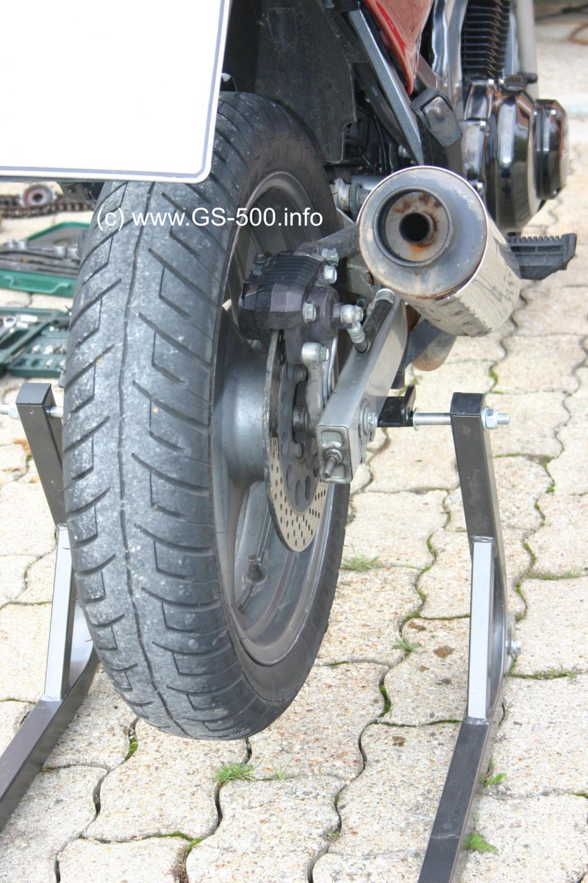 Zuerst bockt man die GS in eine stabile Position auf, entweder man nimmt den Hauptständer, oder wenn dieser nicht mehr vorhanden ist