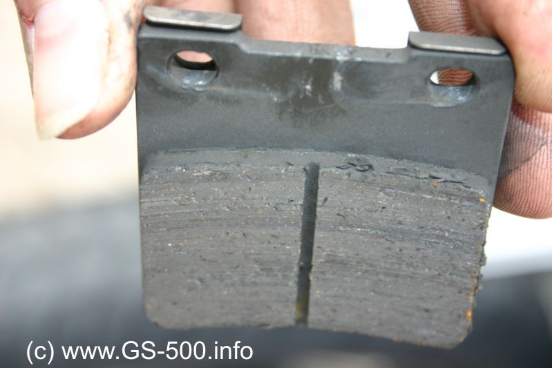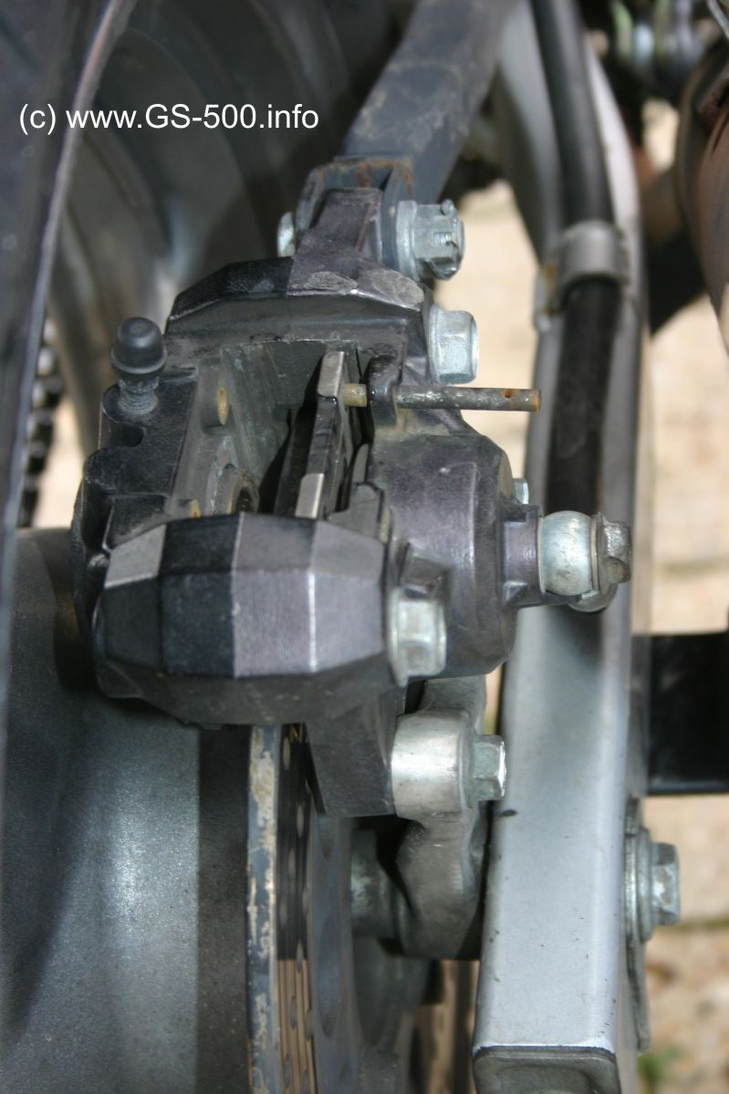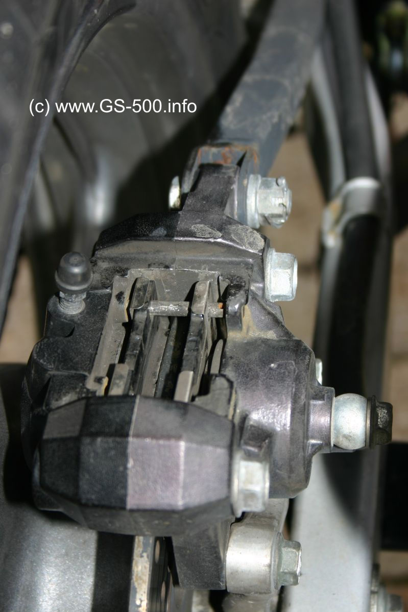 Wenn die Kappe entfernt worden ist sieht man die Bremsbeläge und die Führungsbolzen für die Bremsbeläge.