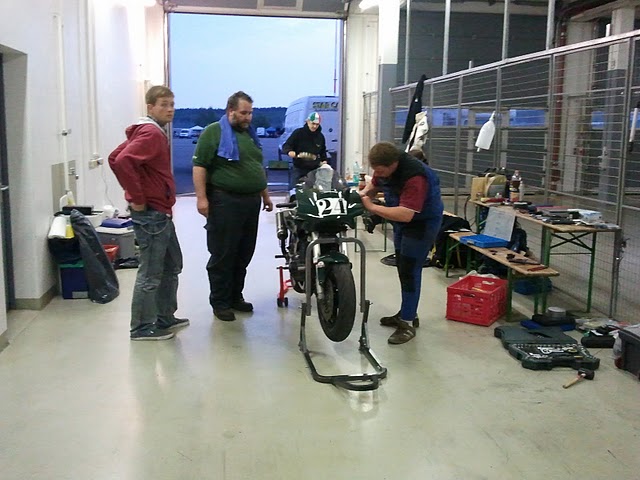 Nach einer kurzen Nacht, ging es dann Samstagmorgen mit den ersten Runden los. Nach kurzer Zeit fing dann an die rechte Seitendeckeldichtung das Nässen an, und wurde im Laufe des Tages so schlimm, das wir die GS aus dem Verkehr zogen und mit den Ersatzmaschinen weiter fuhren. Weiteres Problem war das die GS nach den Runden mit bis zu 145 Grad Öltemperatur wieder rein kam. Das ist viel zu viel, weil der Isolatorlack der Lichtmaschine das nicht ab kann.