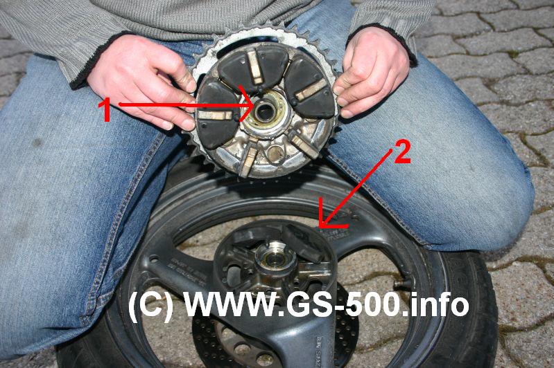 Um den Kettenradträger auszubauen, muss zuerst das [Hinterrad ausgebaut](/hinterrad-auseinbauen/) werden. Nun legt ihr die Felge vorsichtig auf die Bremsscheibe und zieht einfach den Kettenradträger aus der Gummilagerung herraus. Achtet bitte darauf, das ihr die Hülse (Bild 2 roter Pfeil Nr.1) nicht raus fällt.