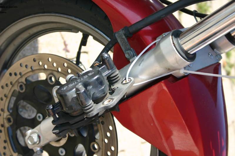 Den demontierten Bremssattel fixiert ihr mit einem Kabelbinder am Gabelholm, damit er nicht lose an der Bremsleitung hängt.