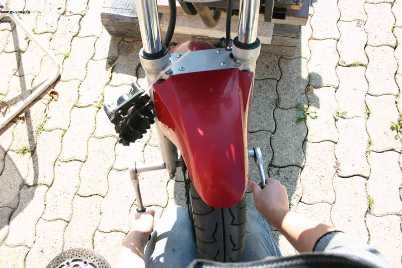Es empfielt sich das Vorderrad zu zweit einzubauen, da es doch eine etwas fummlige Angelegenheit ist die Distanzen, Tachoschnecke, festhalten und Achsbolzen einschieben, alleine zu machen.