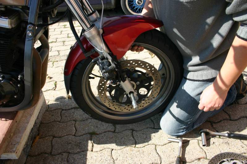 Um das Vorderrad auszubauen, muss man das Motorrad erst einmal so aufbocken das die Gabel mit dem Vorderrad in der Luft ist.